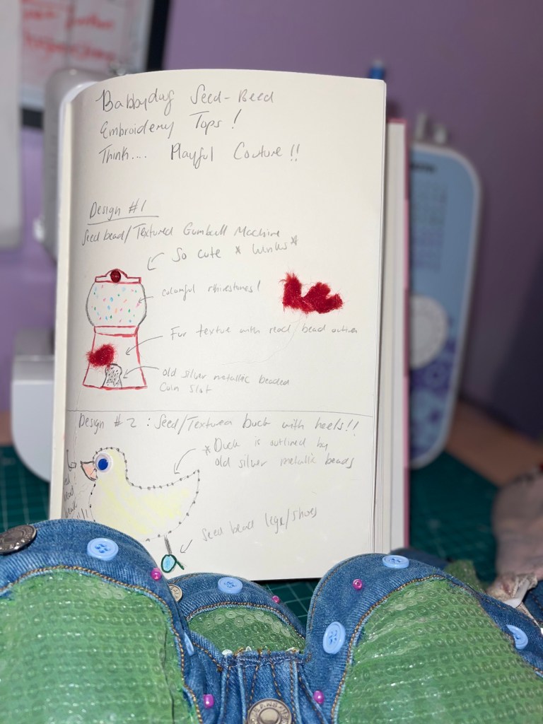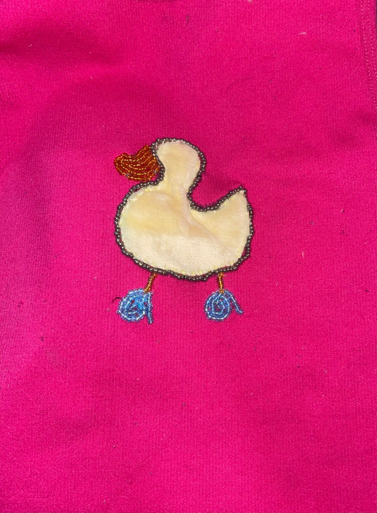 I thought “Well I’ll be damned” and got to work. The original design that I had on a sample was a duckie wearing a necklace in full blown seed beads like a princess. Don’t worry I gave you a duckie wearing heels with sass and cite quirk instead. So cute, but so much labor time. It was starting to feel like I was charging myself hourly like a mechanic just to finish a piece. It needed to be fun. It needed to be bold. It needed to be like rubbing your fingers across sensory sequins at a fabric store.