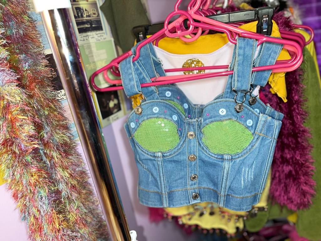 Denim is a certified classic that can be worn in a plethora of ways but what if the boob cups had some art on them? Maybe some bold textiles that felt edgy or sequined fabrics that felt like a daydream. It needed some pizazz to insert itself as a staple piece. Thrifting fabrics like a mf is the go-to for Babbydouf, so I probably went through many old sequined dresses in plum, fuchsia, and disco-ball blue like I was at a fabric trade show. If you know, you know!
